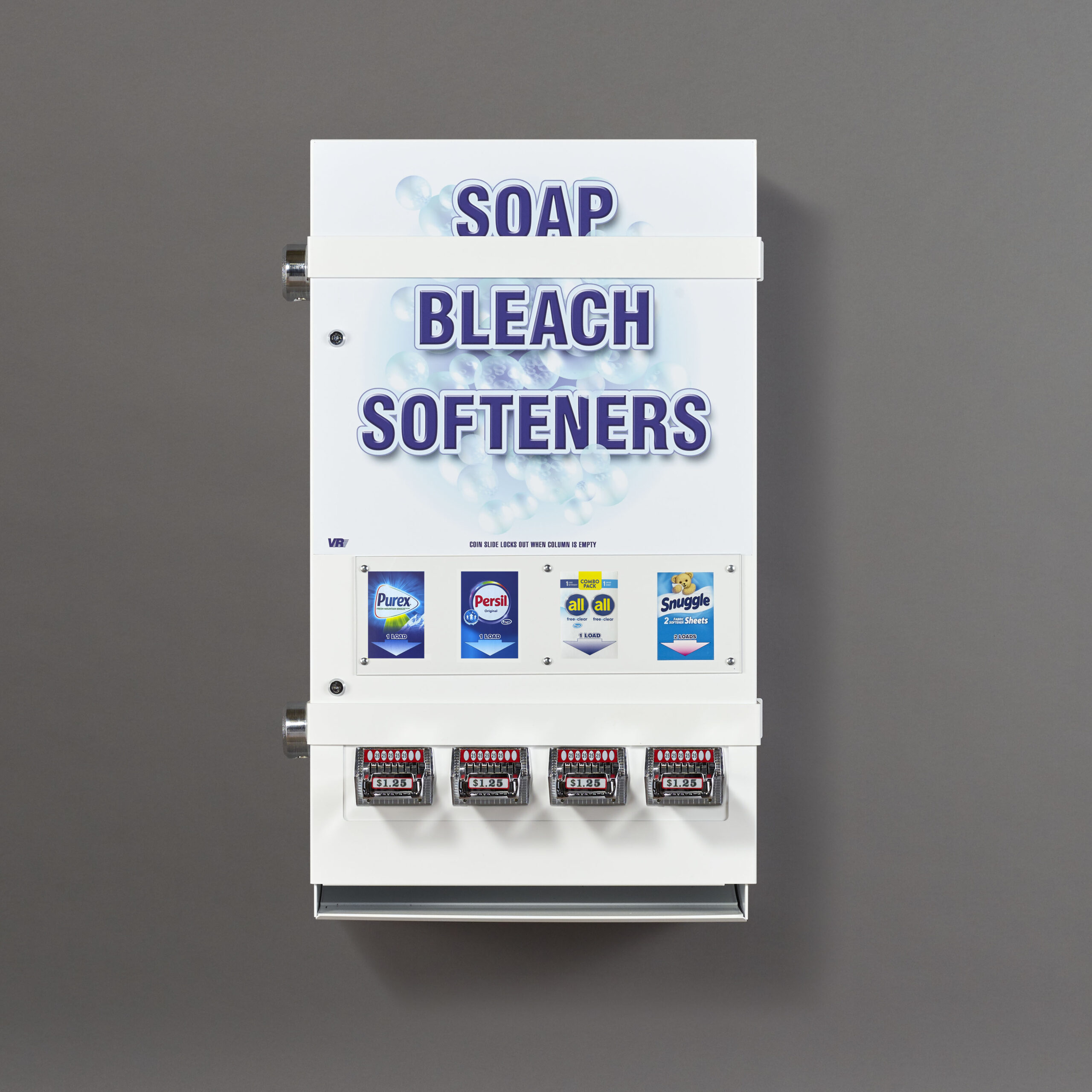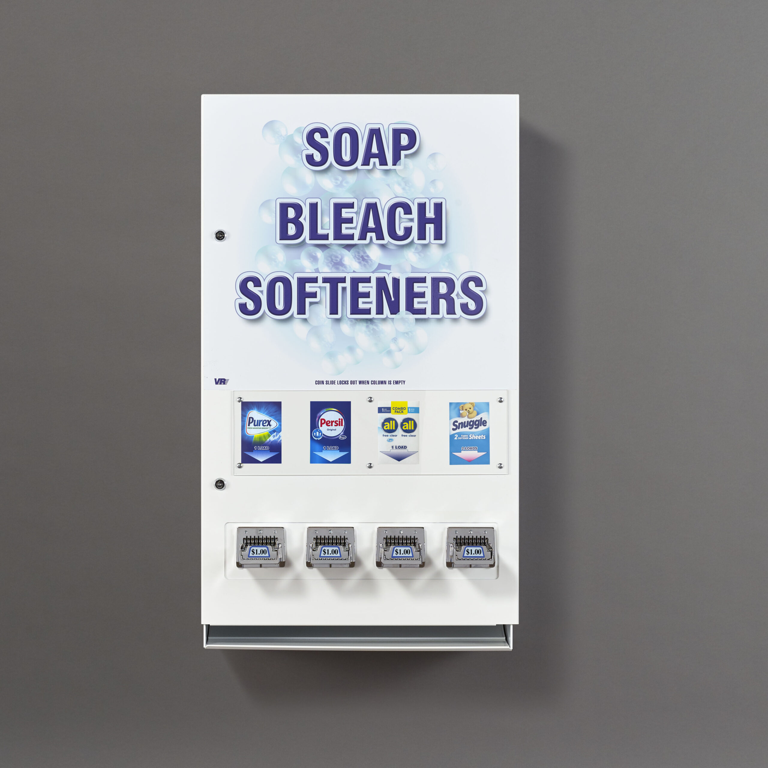 The 494 is a four‐column coin‐slide‐operated vending machine that is perfect for larger hotel/motel or campground laundry rooms and smaller coin laundry stores.