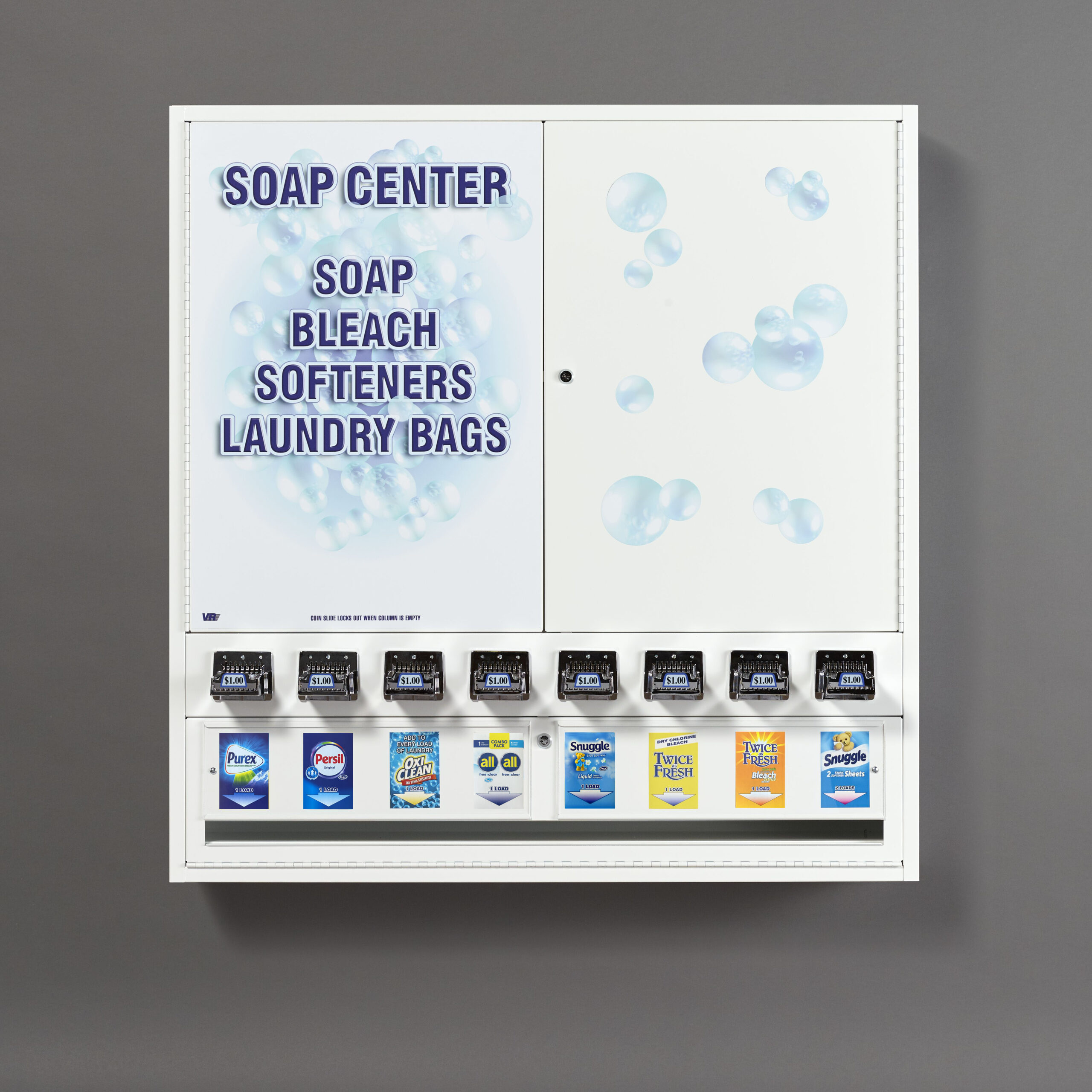 The VendMaster 894 is an eight‐column coin‐slide‐operated vending machine with a capacity of 184 vends. This soap vender ships with 1 case of #650 REAL-TUFF laundry bags (144 bags/case) a $72.00 value.