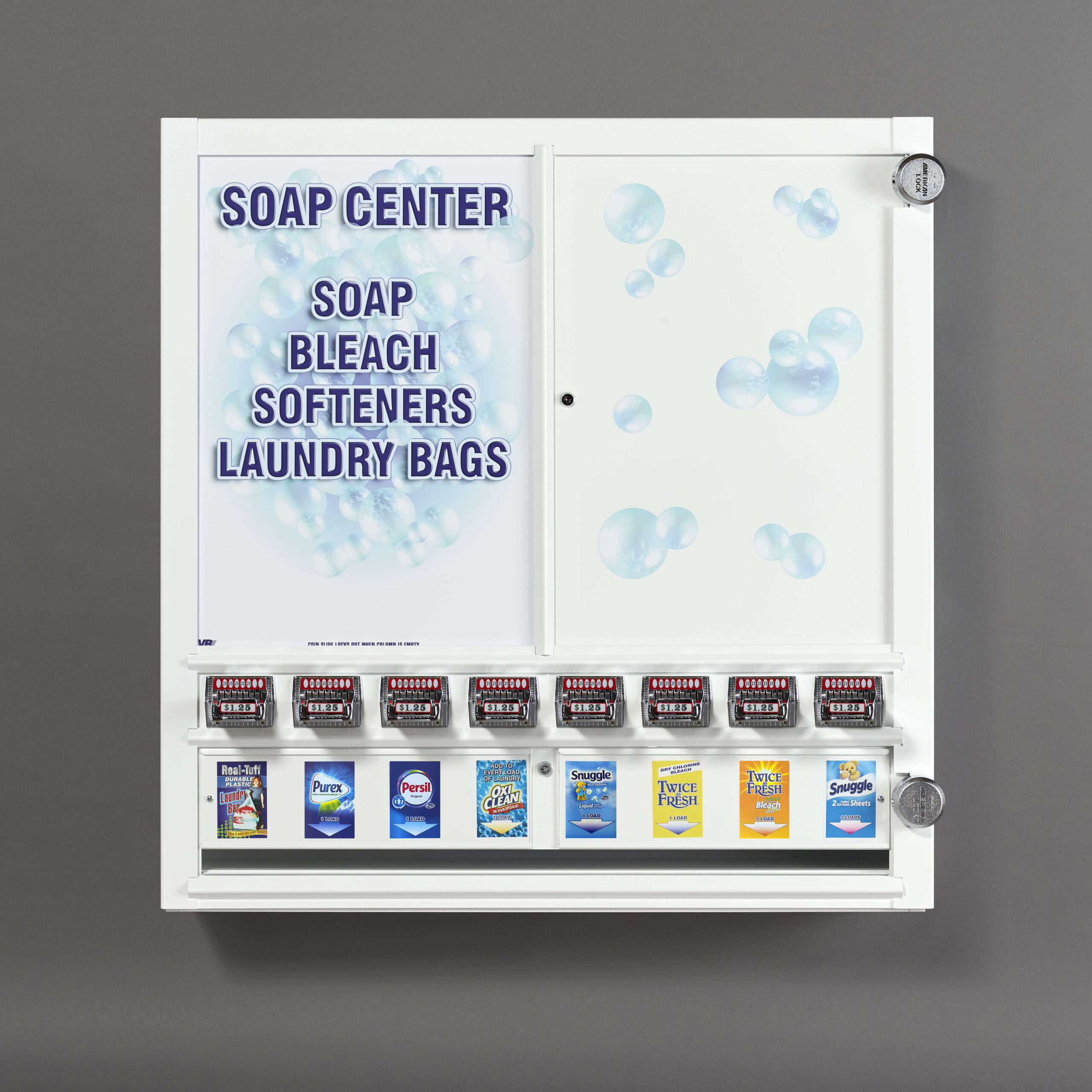 This vender can be set up with a built-in bag vender (specify when ordering), which cuts the soap capacity down to 138 boxes. When this option is ordered the vender is shipped with two cases of REAL-TUFF plastic laundry bags: 1 case of #1500 bags (144 bags/case) – a $72.00 value and 1 case of #1000 bags (120 bags/case) – a $90.00 value